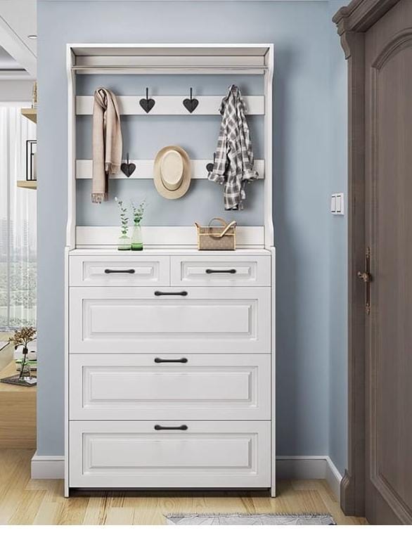 Stop juggling separate shoe racks, coat hooks, and storage drawers — the Alba Hallway Unit organises your entire entryway in one elegant white furniture piece. Featuring 3 flip-door shoe compartments, 2 top drawers, a mid-level display shelf, and an upper rack with 8 coat and bag hooks — all in a clean all-white finish with matte black bar handles and a classic panelled profile. One purchase. Zero entryway clutter. Perfect for UAE apartments, villas, and family homes.