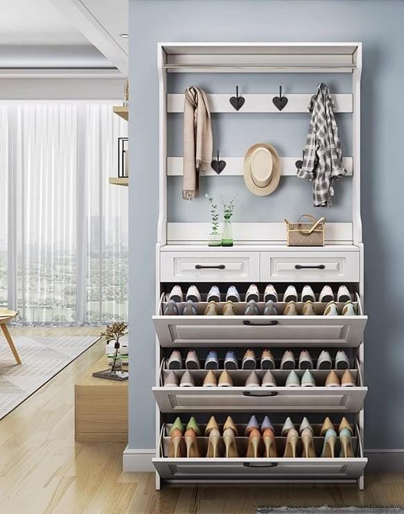 • 3 flip-door shoe compartments — each opens outward to reveal a full row of shoes stored in space-saving tilted formation; combined capacity for 20–30+ pairs depending on shoe size