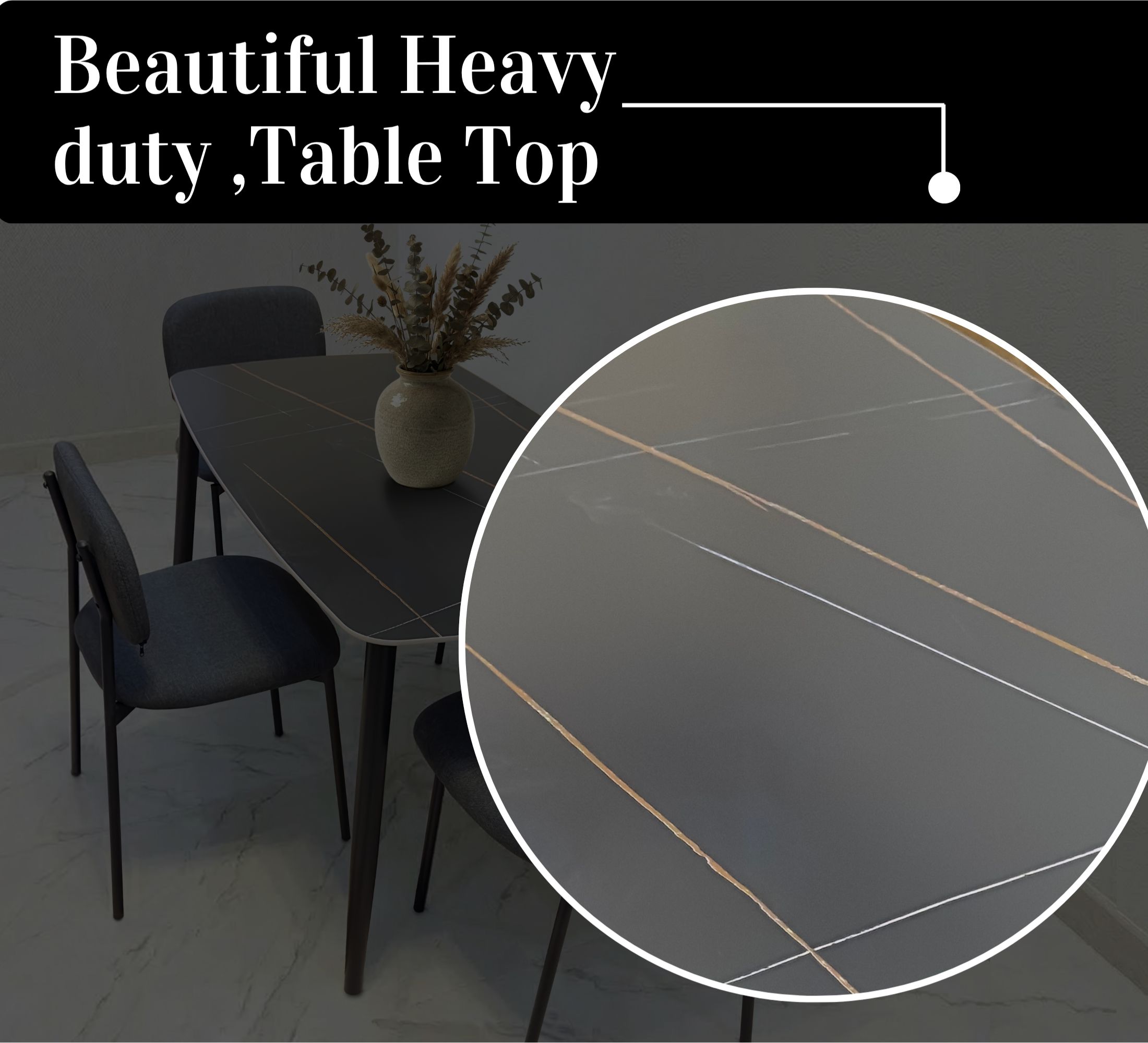 The centrepiece is a bold rectangular dining table finished in a deep black sintered stone surface with elegant gold and subtle blue vein detailing — a design inspired by high-end Italian marble aesthetics. The tabletop features smooth, well-finished rounded edges for a refined, premium feel, while the white border accent adds a sleek contrast detail.